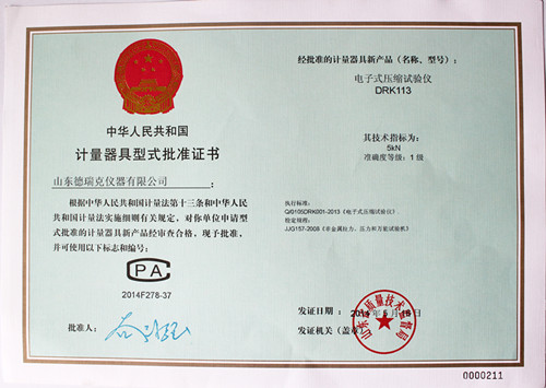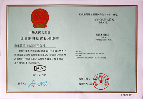 近日,德瑞克接到市局通知,在濟南市質量技術監督局一樓計量器具型式許可證窗口領取到了電子拉力試驗機型式批準證書(證書編號2014F376-37),加上之前領取的電子式抗壓試驗機(證書編號2014F277-37)、電子式壓縮試驗儀(證書編號2014F278-37)的型式批準證書,至此,德瑞克涉及的國家法定監管的計量產品已全部獲得證書。