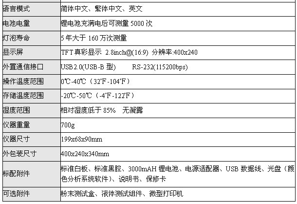 WF32色差儀是一款高精度、高穩定性、多功能的色差儀。WF32擁有8種測量光源(A、D50、D65、C、F2、F7、F11和F12);六種顯色模式(CIE1976LAB、CIEXYZ、CIELUV、HunterLAB、sRGB、白黃度);八種色差公式(△E*ab、△ECMC、△EISO、△ECIE94、△EFCMⅡ、△ELuv、△Ehunter、△EsRGB);三種語言模式(簡體中文、繁體中文和英文);有三種測量口徑供用戶選擇。WF32色差儀還能進行白黃度測量和平均測量,有大容量數據存儲空間,也可以外接微型打印機進行測量數據的實時打印,并能與儀器標配的《顏色分析系統》軟件配合使用。